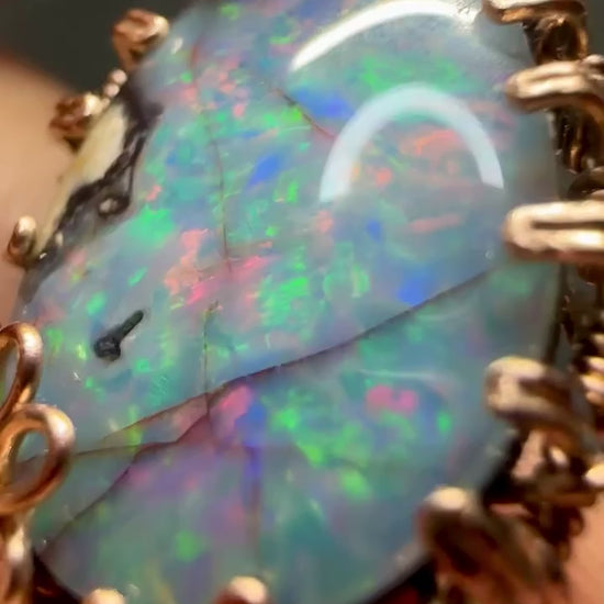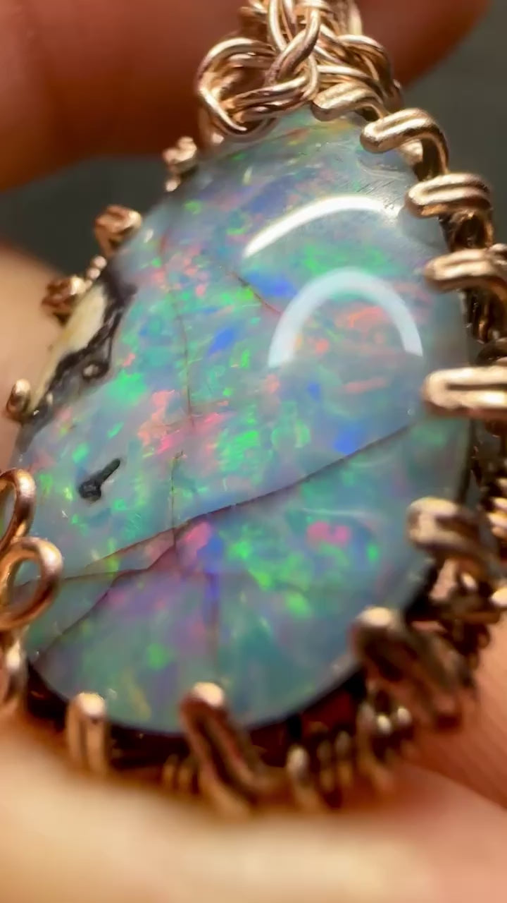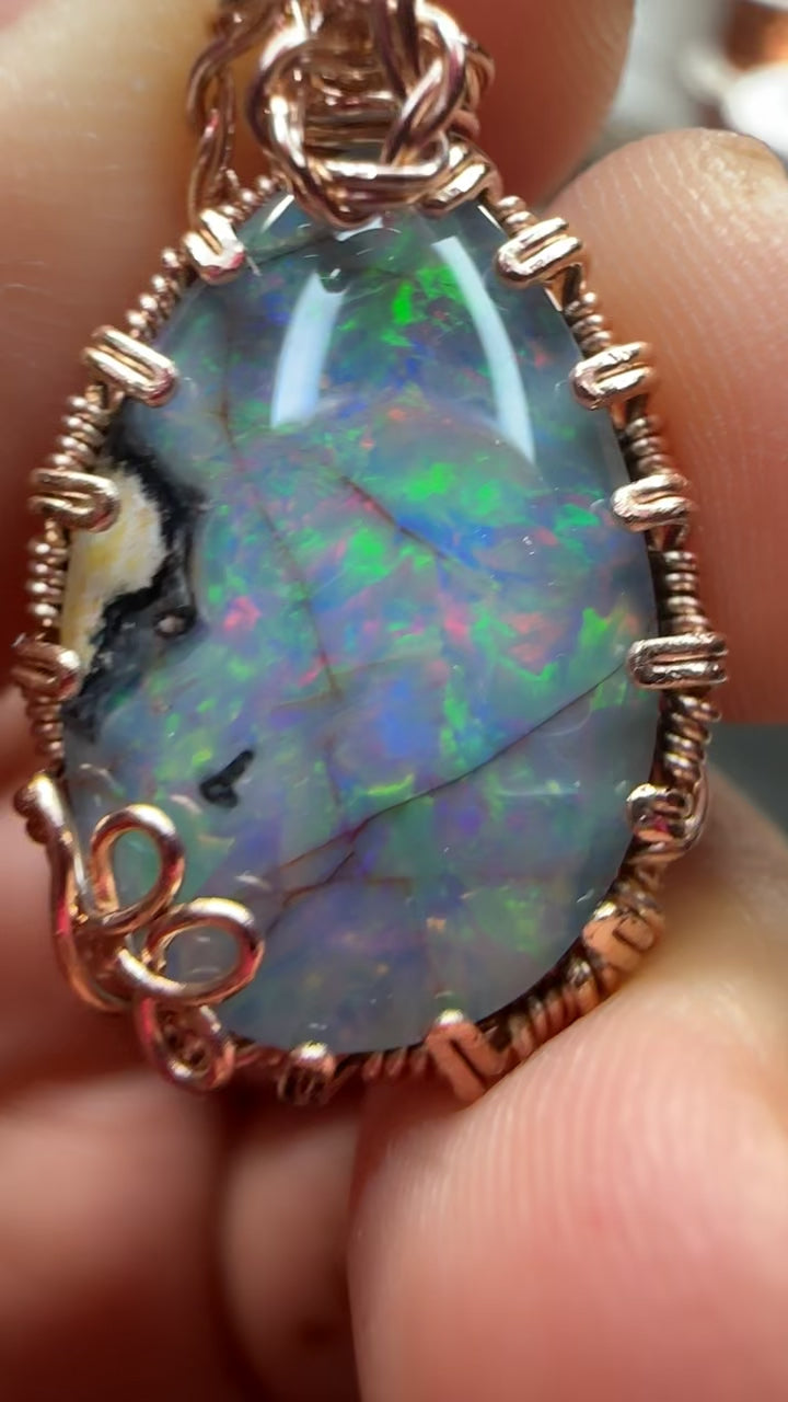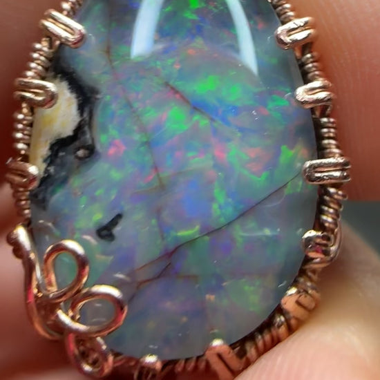 This absolutely stung Spencer opal from Idaho is filled with the most brilliant pastel fire. Set in a high quality 14k rose gold filled weave to match its brilliance.