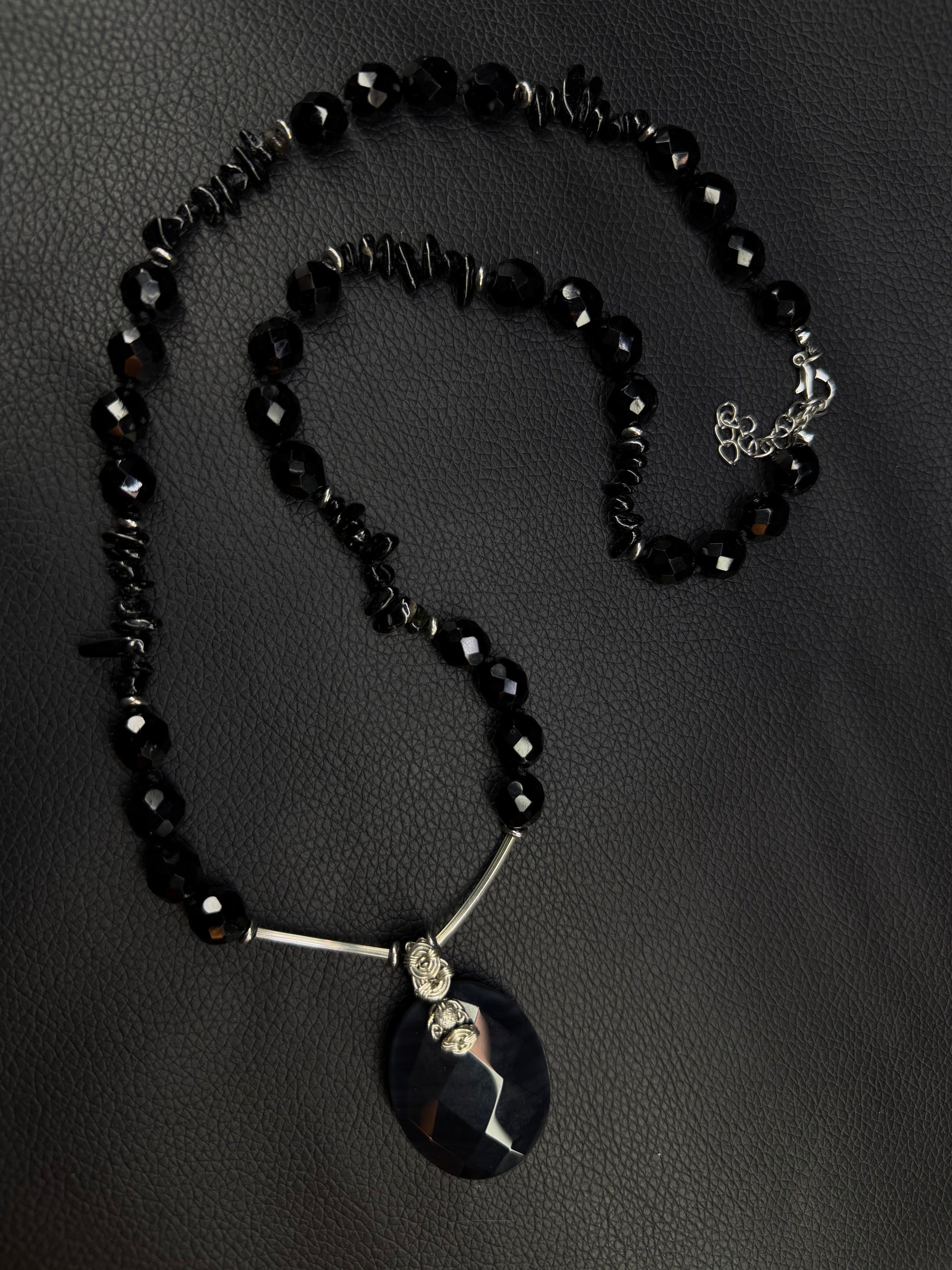 Beautiful Onyx pendant wrapped in 925 sterling silver on an onyx and obsidian chip beaded necklace with silver findings