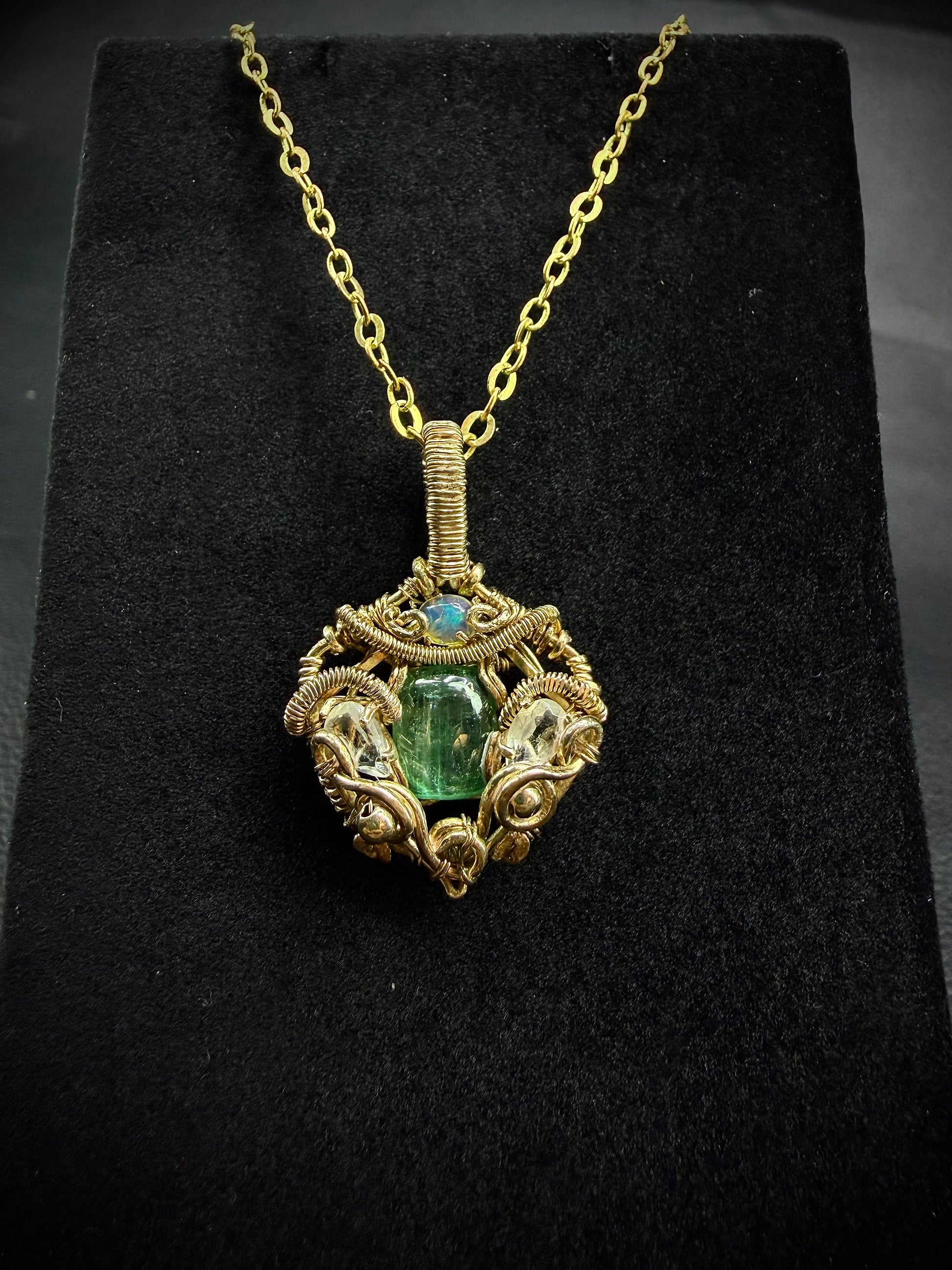 Gorgeous rainbow filled green Kyanite accented with Ethiopian opal and Brazilian Clear Quartz weaved in a 14/20 gold filled wire.