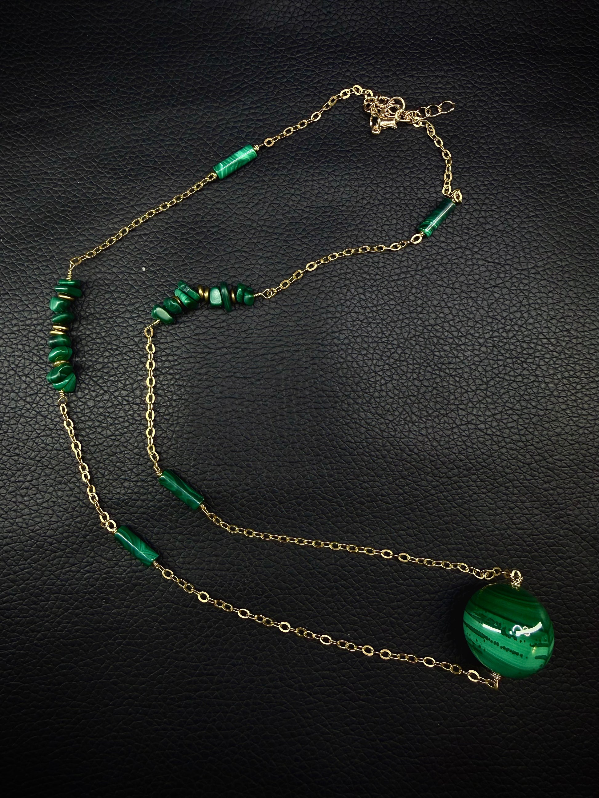 Large single magnificent Malachite bead on a brass chain accented with malachite chip and tube beads.