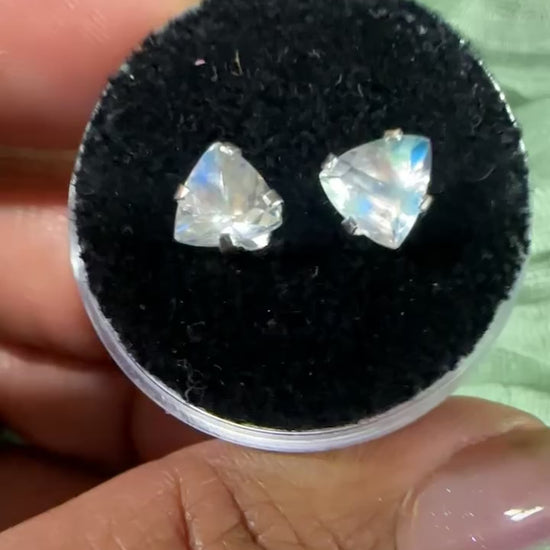 Trinity cut Malagasy Rainbow Moonstone stud earrings set in 925 sterling silver