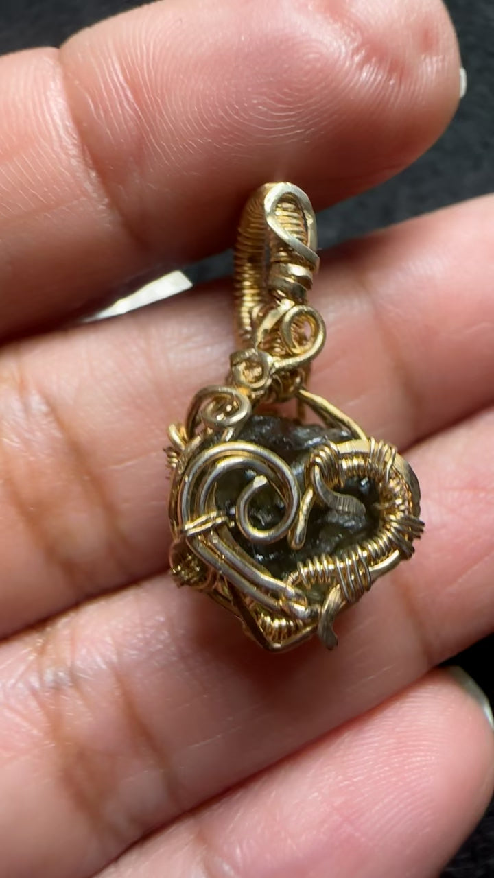 Natural raw Moldavite pendant weaved in a 14/20 Gold Filled wire
