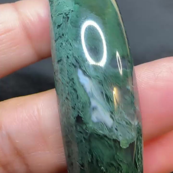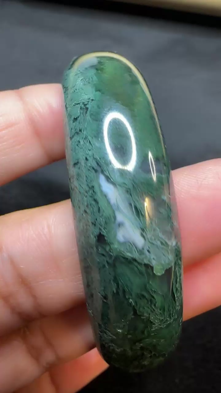 The look of the bangle and comfort of clasp bracelet! Gorgeous super saturated dark moss agate half bangle accented with black jade beads. Fits 7.5-9” wrist.