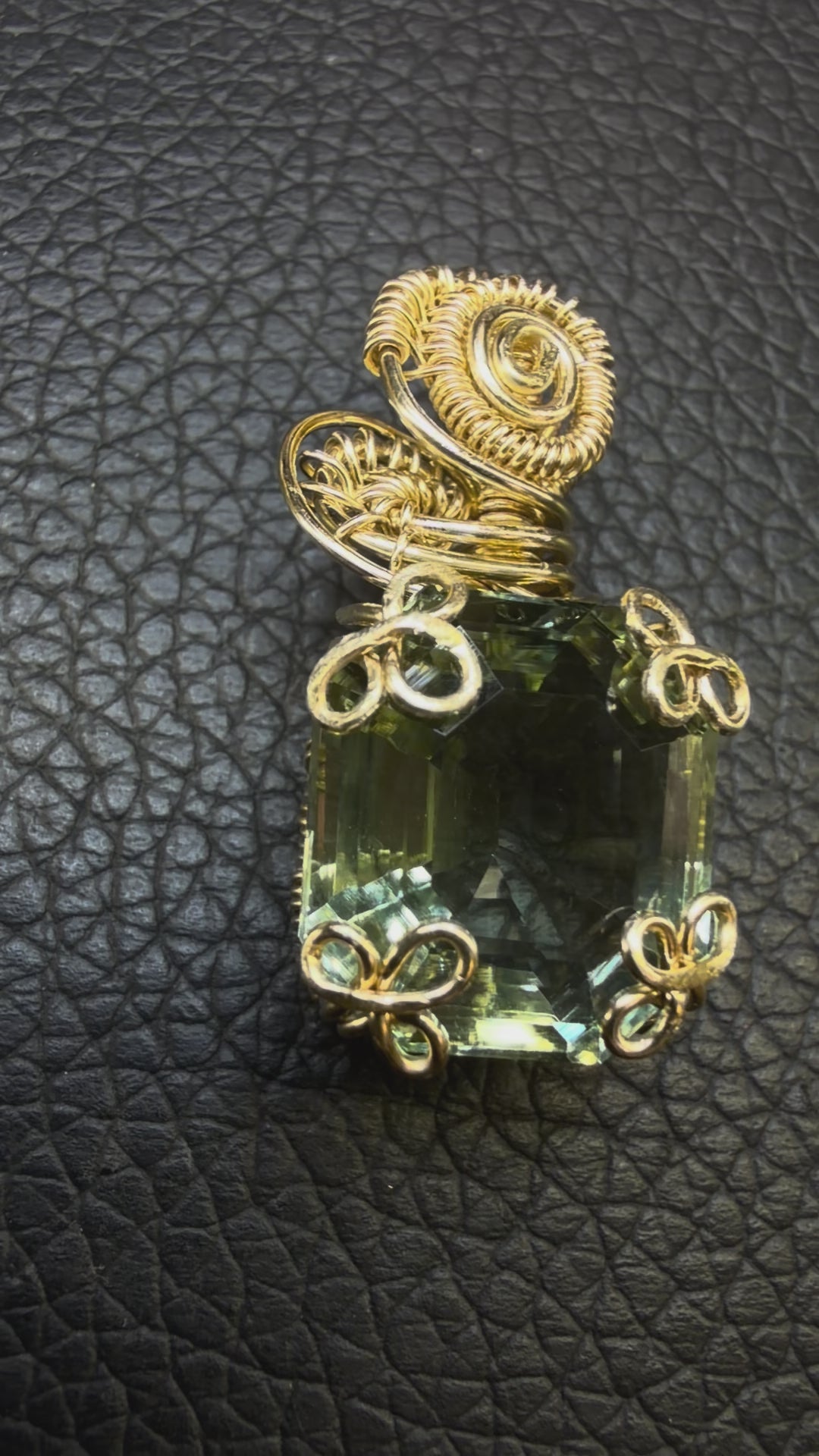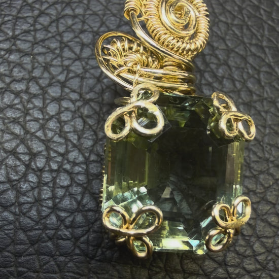 Beautifully cut prasiolite pendant aka green amethyst set into a brilliant bronze clover setting.