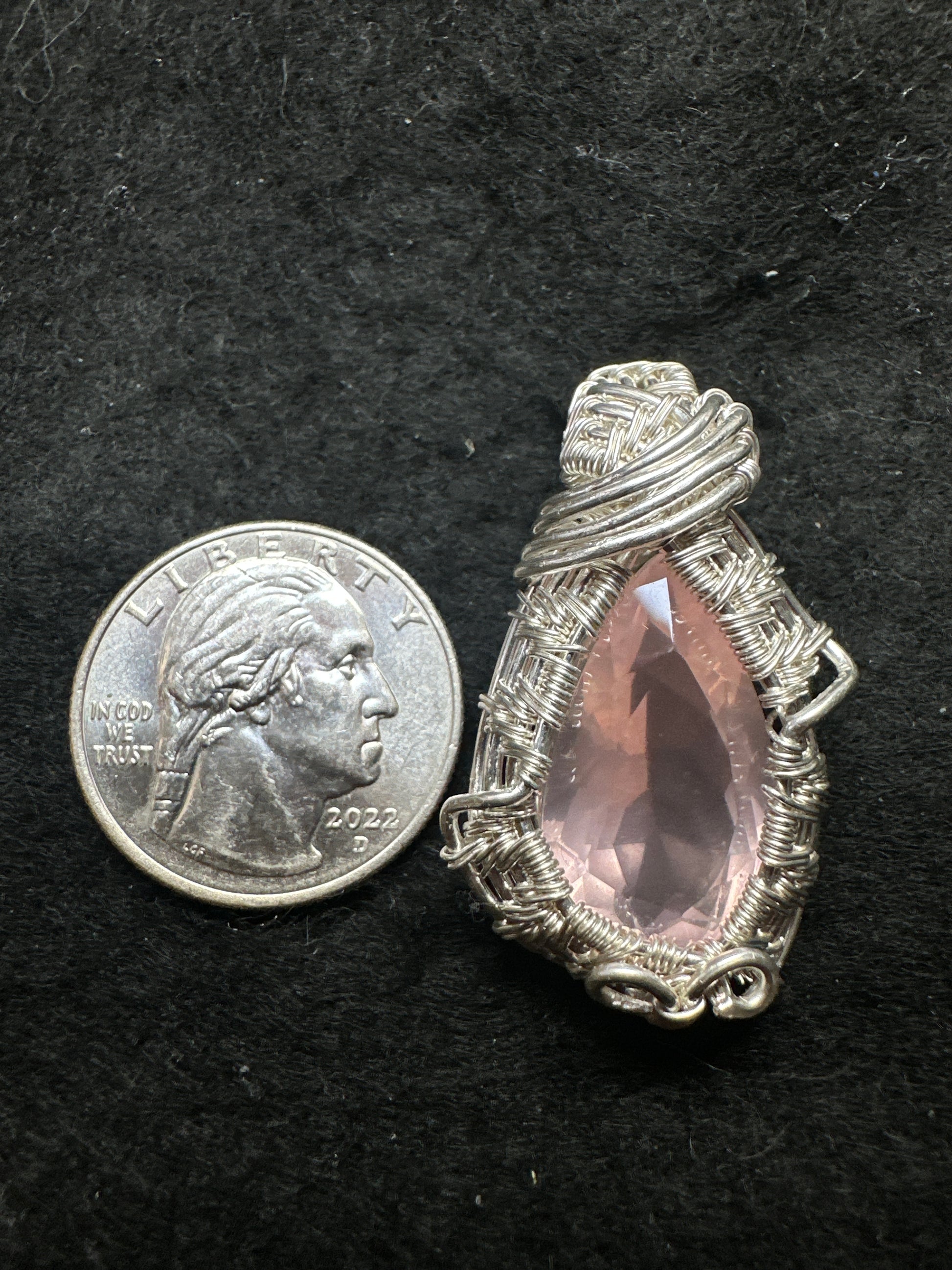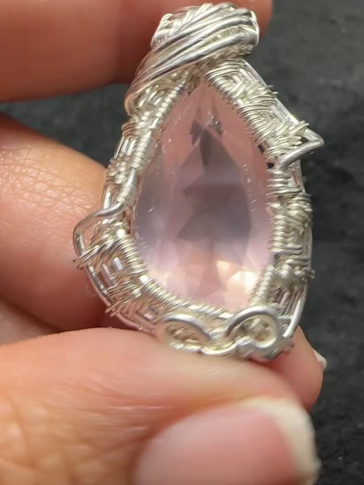 Beautifully cut rose quartz facet weaved in a brilliant 999 fine silver filled wire.