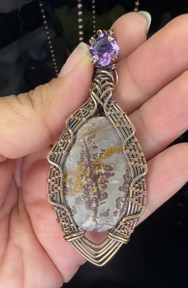 Beautiful pale Purple, Mauve and Yellow Dendritic Jasper weaved into a high quality copper setting and accented with a large amethyst cushion cut. Comes with a standard 20 inch ballchain to match