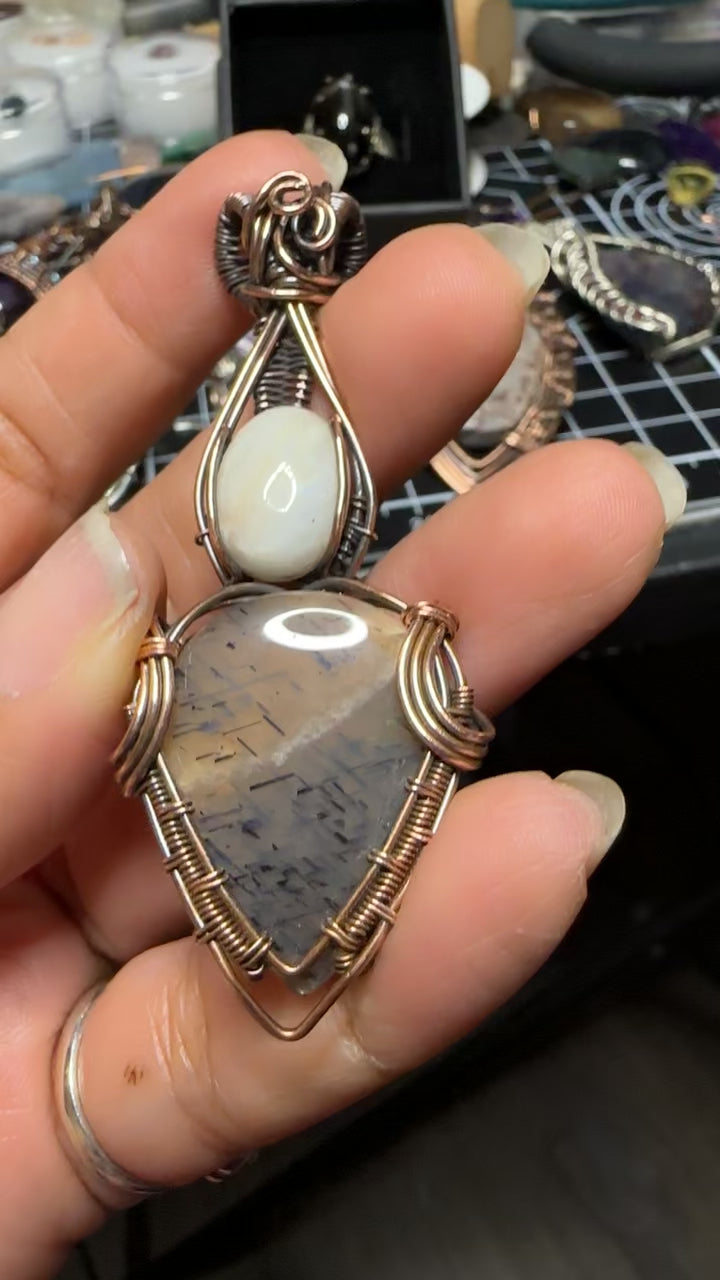 Absolutely stunning and very unique rainbow lattice sunstone from Australia accented with a white moonstone. Not a very common material and a must for any sunstone collector. Comes with a standard 20 inch ball chain.